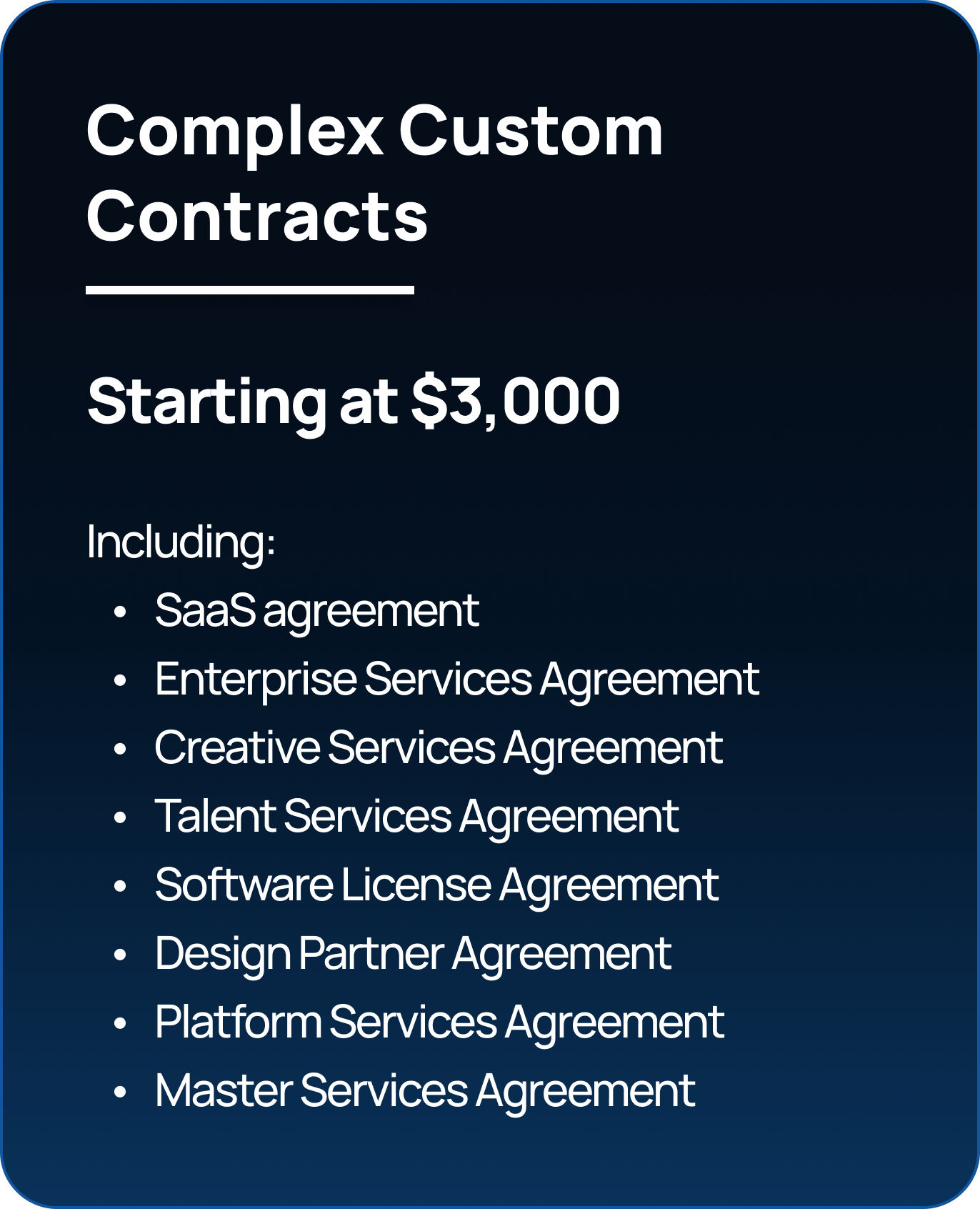 PROJECT BASED PRICING Unlimited flexibility, without the fear of surprise bills.Don’t see what you need? Reach out to us for a quote! Entity Formation Financing IP & Website Contracts